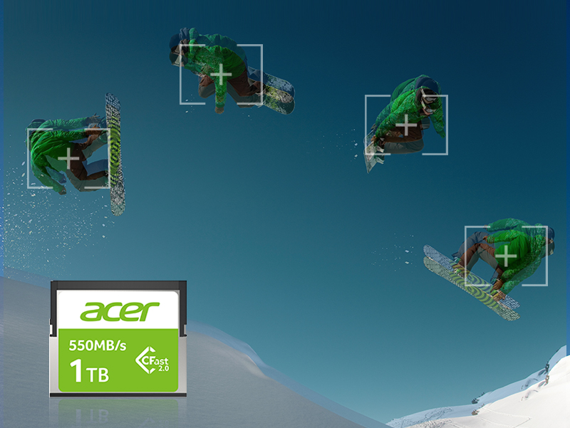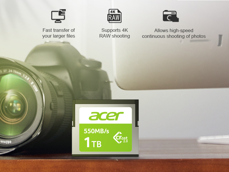Acer CF100 memory card adopts high-quality MLC NAND to achieve superior read/write speeds and shoots fast-action photos and 4K RAW ultra-HD videos seamlessly and consistently. With a capacity of up to 1TB and compatibility with the devices that supported CFast 2.0, CF100 is ideal for shooting 4K UHD videos and burst-mode photography indoor and outdoor.