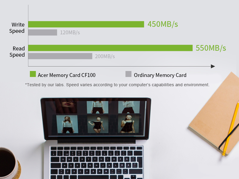 Acer CF100 writes up at speeds up to 450 MB/s*. Supports 4K RAW Ultra HD video recording, allowing users to make full use of the powerful performance of any high-end photography equipment.