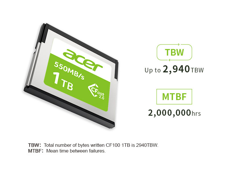 Acer CF100 offers impressive read speeds of up to 550 MB/s*, allowing users to more quickly transfer card footage. You’ll work faster– and save more time for post-processing. This CFast™ 2.0 memory card delivers the type of high performance that broadcast, cinema, and photography professionals demand to get the most out of their professional cameras.