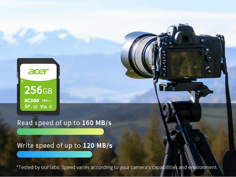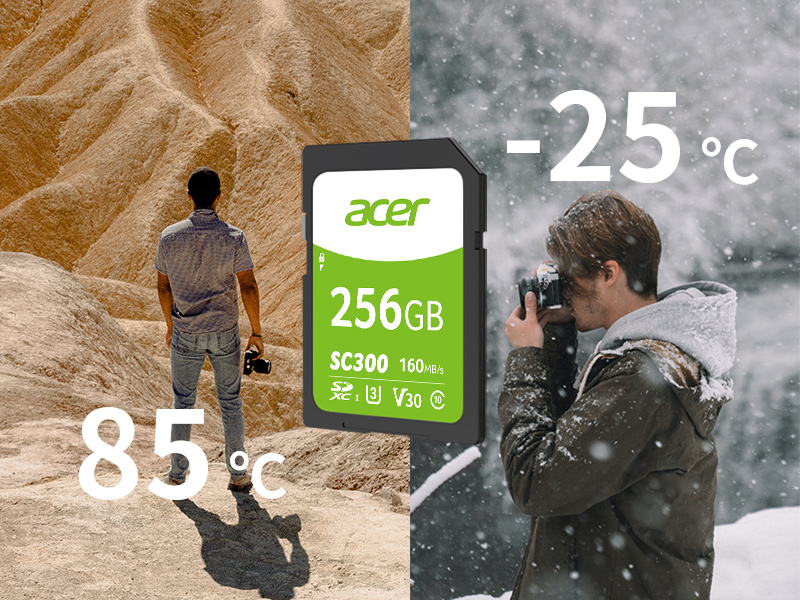 Built for professional photography, Acer SC300 features ultra-fast shooting and wide compatibility. With a capacity of up to 256 GB, Acer SC300 helps users to create and share high-quality recordings to fully enjoy video photography.